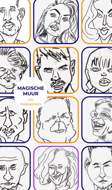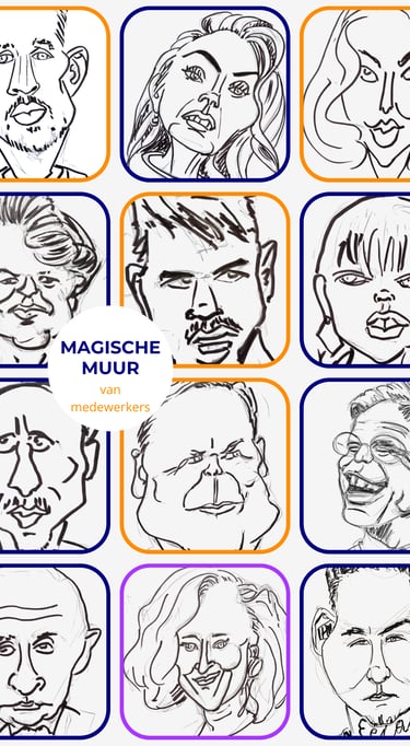 Teken je collega's vanuit verschillende gezichtspunten. Je wordt ook zelf getekend natuurlijk! We maken de Magische Muur van Medewerkers.